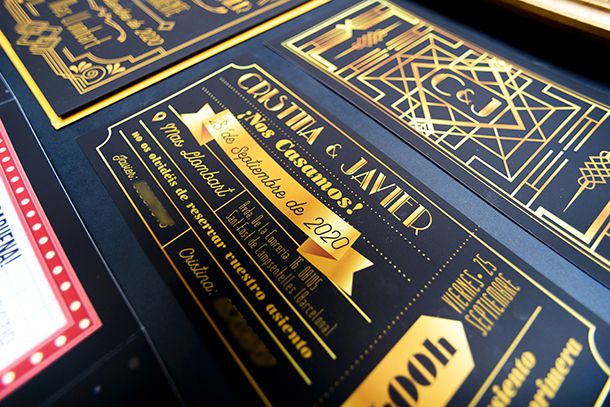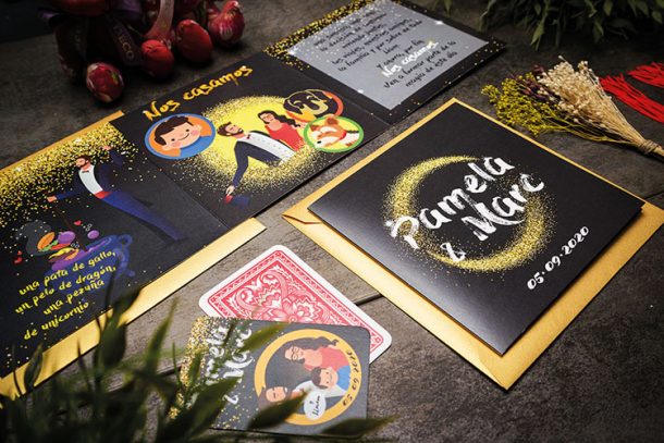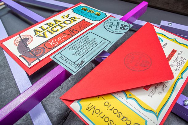 For V&D a couple of “periquitos”, we made a colorful invitation with metallic finishes.